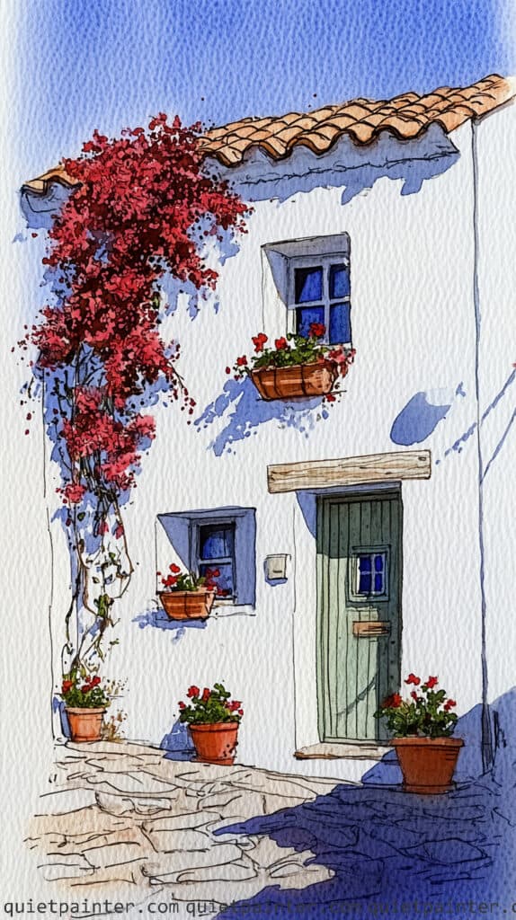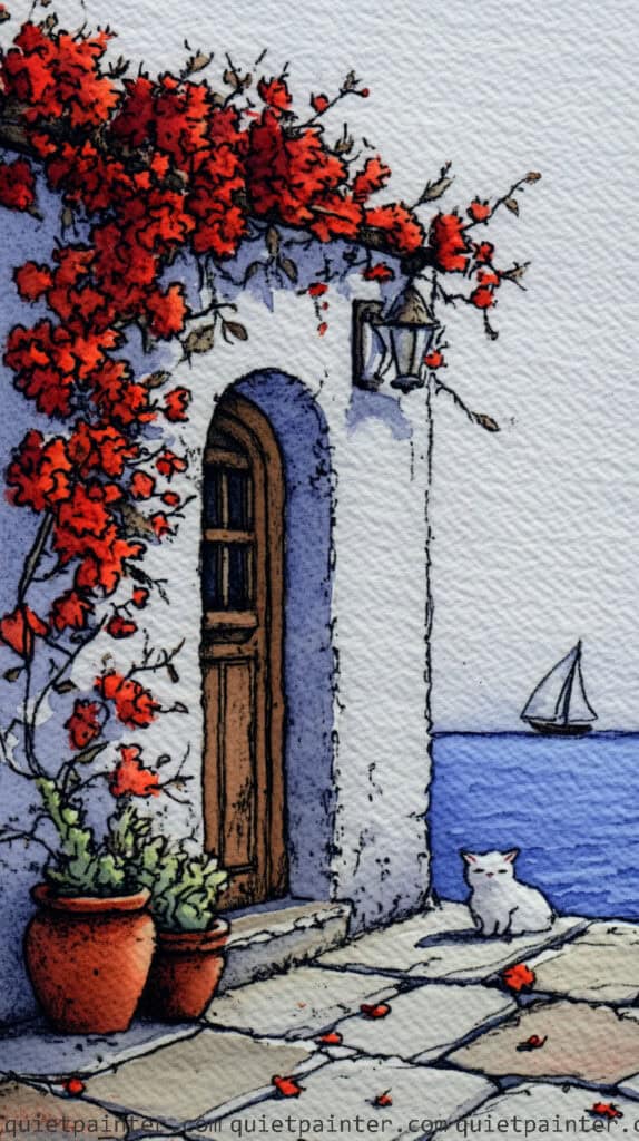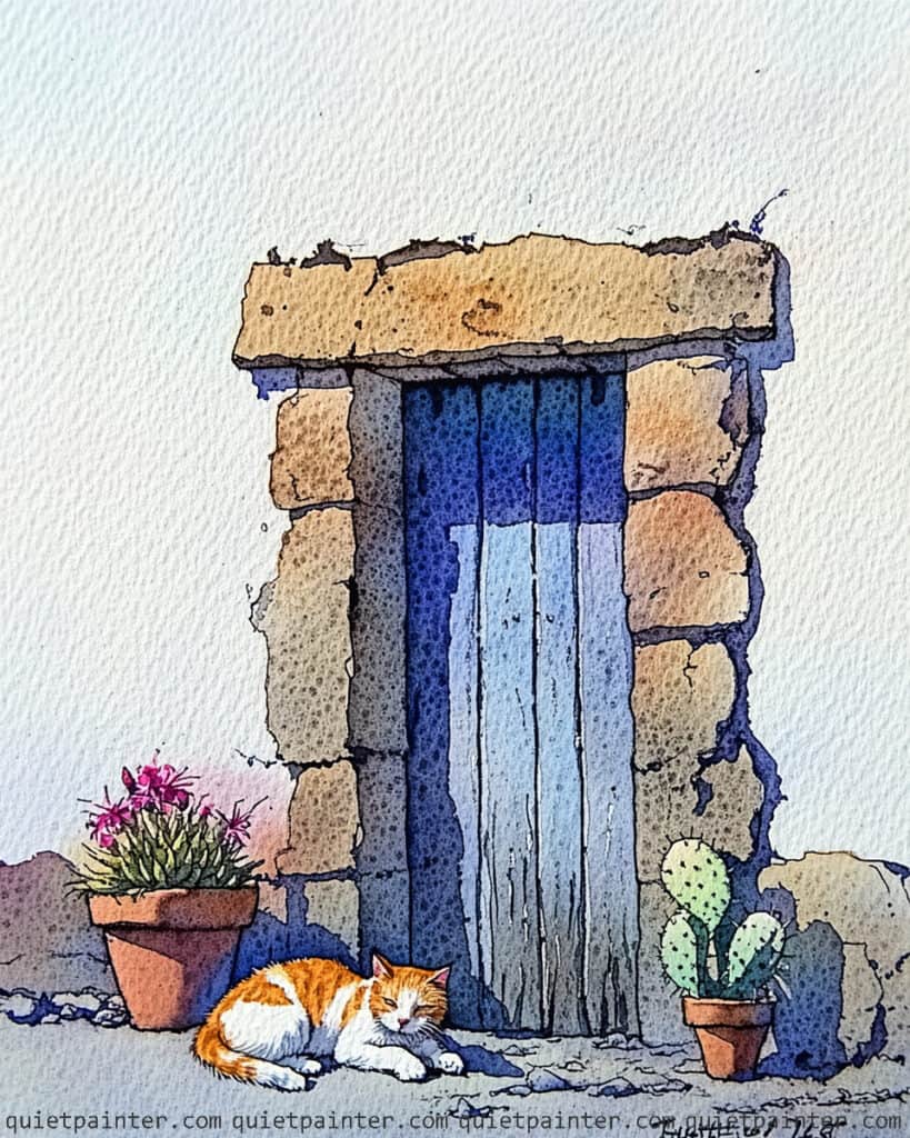To finish, wash the terracotta pots and the wooden door in warm earth tones, adding vertical lines for the door planks once the base is dry for structural clarity. Use a multi-tonal wash for the cobblestones, alternating between warm ochres and cool greys, and leave the white cat as the pure white of the paper to act as a high-contrast focal point. Finally, glaze a crisp, diagonal shadow across the patio using a diluted violet-blue, which grounds the scene and enhances the feeling of a warm, sun-drenched afternoon by the coast.