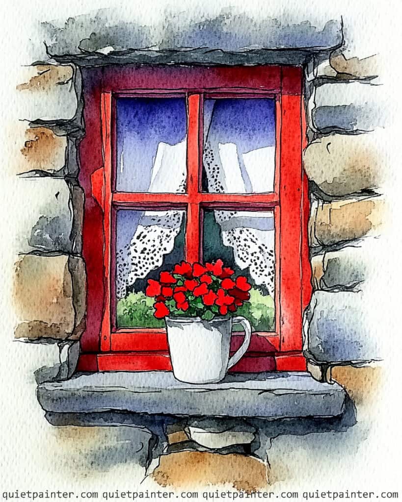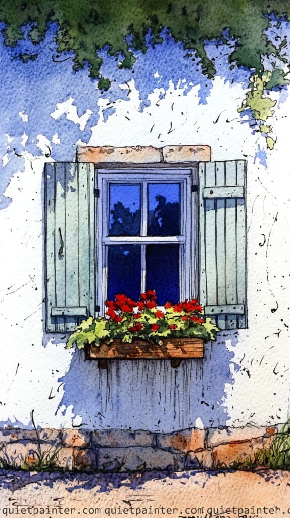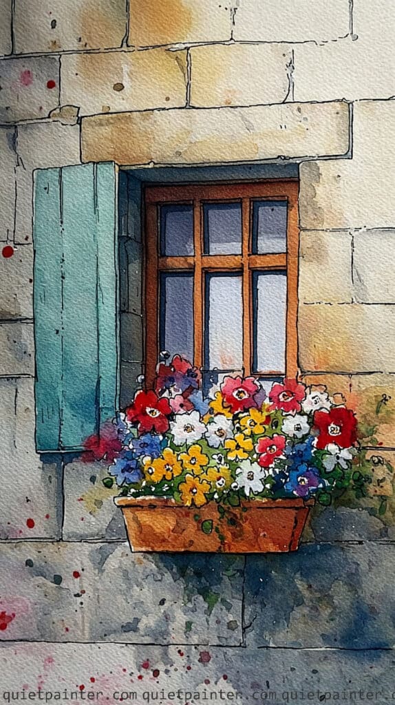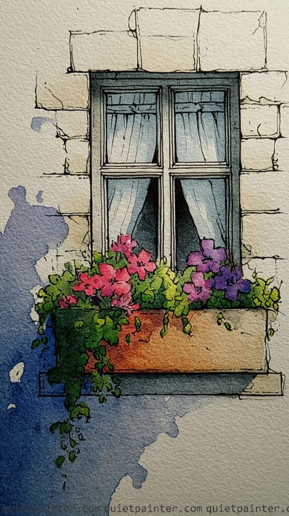 To bring the window box to life, use a wet-on-dry technique to dapple a dense variety of blooms using saturated reds, yellows, and whites over a base of dark green foliage. Paint the wooden planter in a warm terracotta tone, adding a sharp, cool-toned shadow immediately beneath it to anchor the box to the wall. Finish the piece by using a fine brush to add a few loose “petal drops” of red and pink ink across the lower stones, which adds a sense of organic movement and realism to the scene.