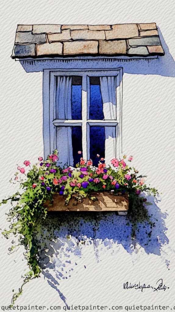 Next, block in the window frame with a saturated flat wash of warm brown, leaving a few tiny slivers of white paper on the edges to represent sunlit highlights. Use a stippling motion to paint the vibrant pink and purple flowers in the window box, layering different saturations over a base of bright sap green to create a sense of full, rounded blooms. Finish the piece by glazing a cool-toned shadow beneath the window sill using a diluted Payne’s Grey, which grounds the planter and defines the strong, directional light hitting the facade.