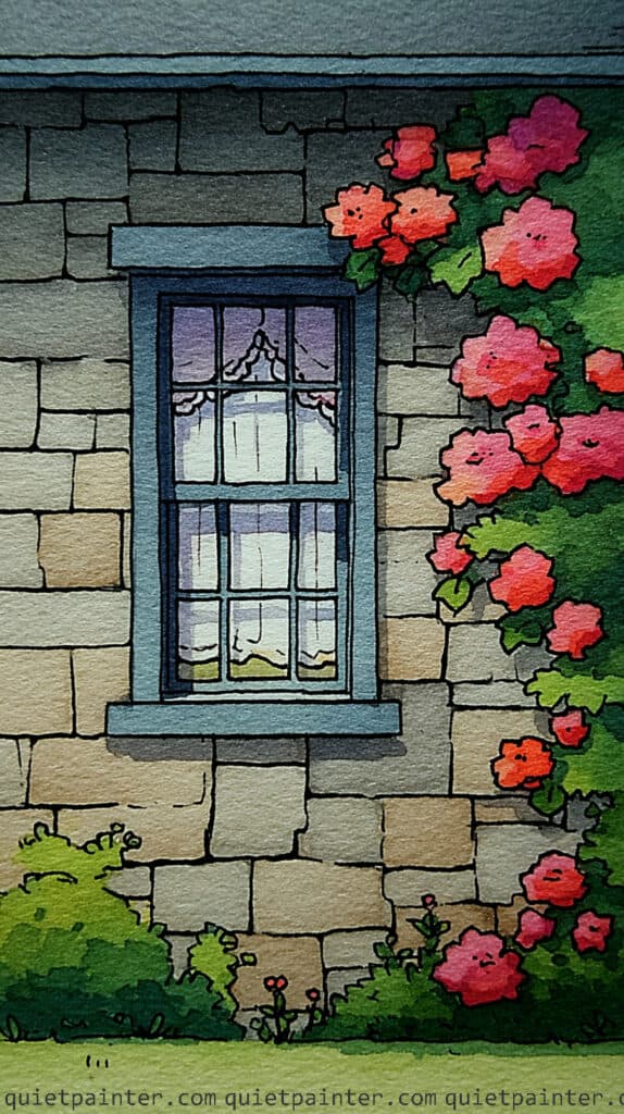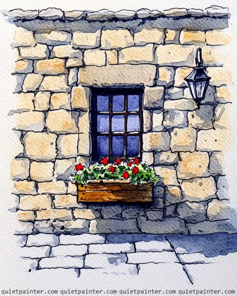 Begin by sketching the blocky, irregular stones and the multi-paned window with a waterproof fine-liner, keeping the lines for the flowers loose and circular. Apply a variegated wash of warm ochre and pale grey to the stone wall, and while the paper is damp, drop in a deeper neutral tint into the recessed mortar lines to create a three-dimensional effect. For the window, use a saturated wet-on-dry application of deep violet and blue for the glass, carefully painting around the white lace curtains to preserve the paper’s highlight.
