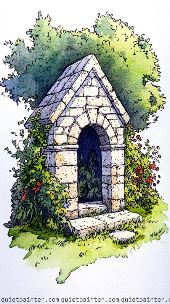 Begin with a light ink sketch to define the blocky stones and the tall, arched wooden door, keeping your lines broken and organic to suggest age. Apply a granulating wash of warm ochre and pale grey to the stonework, and while damp, “charge” in some darker umber into the crevices to create a three-dimensional effect. For the doorway interior, use a saturated wet-on-dry application of deep indigo or violet, leaving the wooden door as a warmer mid-tone to make it recede into the shadows.