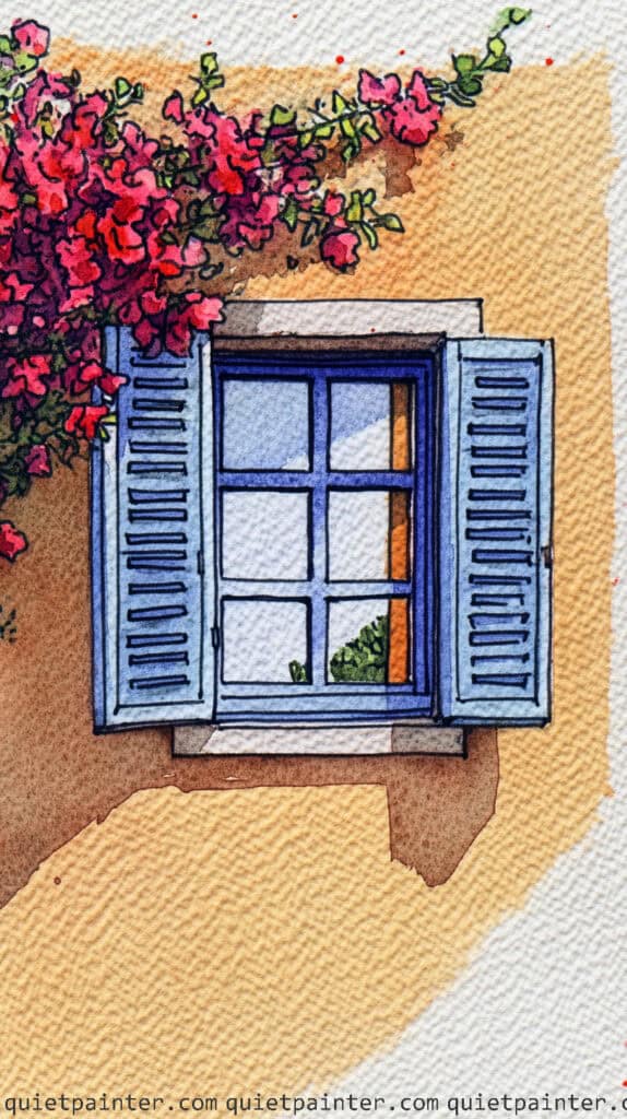 Begin with a light ink sketch to define the irregular, blocky shapes of the stone wall and the clean lines of the wooden window frame and single shutter. Apply a granulating wash of warm ochre and pale grey to the stones, dropping in tiny “splatters” of darker pigment while wet to mimic natural weathering and mineral spots. For the window panes, use a flat, desaturated blue wash, leaving the vertical mullions as unpainted white paper to provide architectural structure and a sense of reflected light.