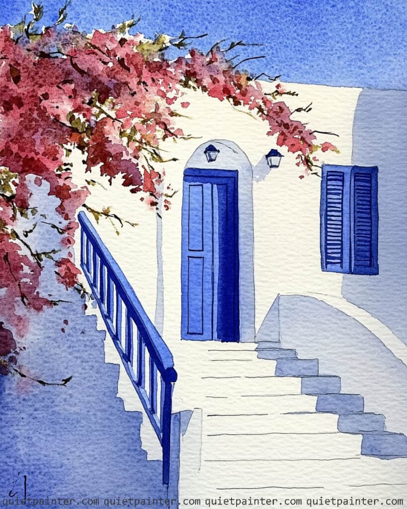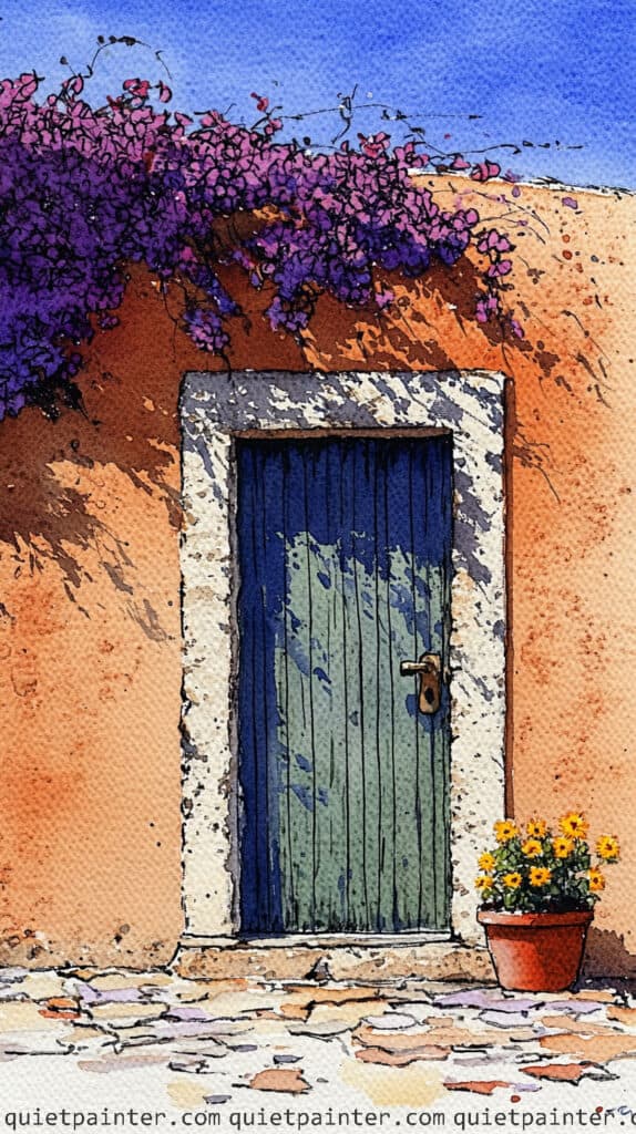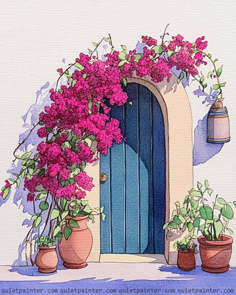Begin with a light pencil sketch to define the archway and the vertical planks of the blue door, leaving the wall area largely blank to utilize the white of the paper. Apply a variegated wash of teal and deep blue for the door, then immediately glaze the large, diagonal shadow across the wall using a diluted mix of violet and blue. For the bougainvillea, use a saturated dabbing technique, layering several shades of magenta and pink while the paper is slightly damp to create a sense of full-bloom volume.