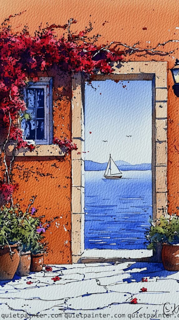 Begin with a delicate ink drawing to establish the arched doorway, the texture of the stone pavers, and the distant silhouette of the sailboat. For the sea and sky, apply a graduated wash of bright blue, keeping the horizon line sharp to separate the two elements. Use a wet-on-wet technique for the cascading bougainvillea, dropping in saturated reds and oranges, then allowing some of the pigment to bleed into a soft violet shadow on the white wall to suggest depth and bright sunlight.