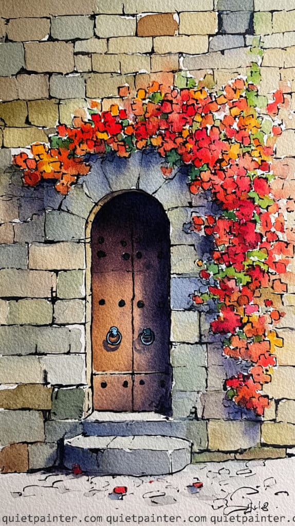 To bring the focal point to life, use a stippling technique with concentrated red, orange, and yellow to dapple the cascading flowers on the right. Allow some of the brighter pigments to bleed into each other while wet, then add a few dark green leaves beneath for contrast. Finish the piece by glazing a crisp, cool shadow at the base of the arch and adding a few loose “splatter” dots of red near the steps to represent fallen petals.