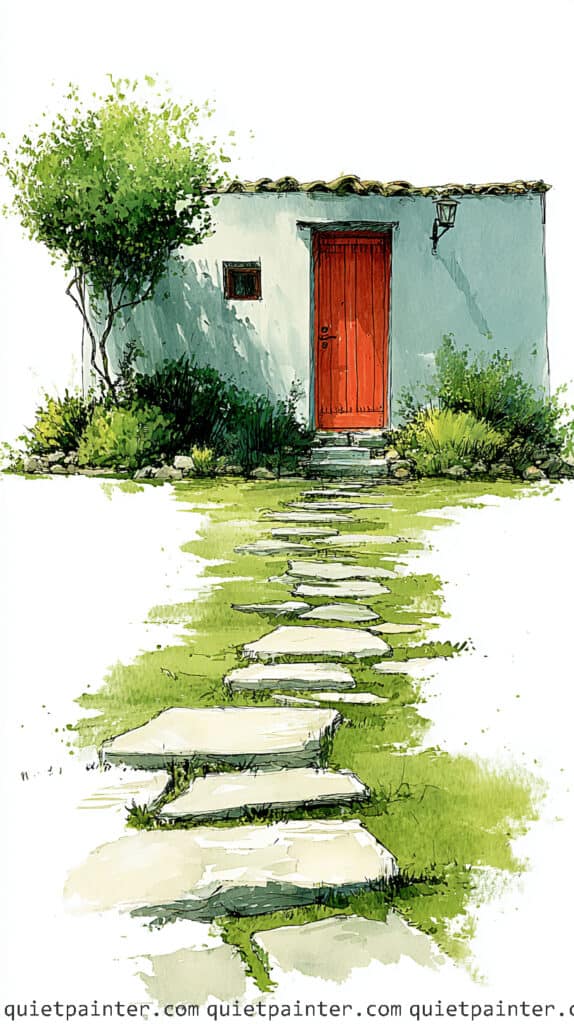Begin with a light ink sketch to define the cottage, the vertical planks of the red door, and the irregular shapes of the stepping stones. For the white walls, utilize the white of the paper for the brightest highlights, then glaze a large, soft shadow across the left side of the building using a diluted variegated wash of cobalt blue and violet. For the door, apply a saturated flat wash of bright red, leaving thin slivers of unpainted paper along the plank edges to suggest a sun-drenched, weathered texture.