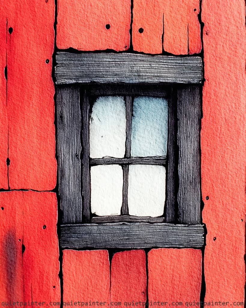 Begin by sketching the vertical lines of the wooden planks and the thick, rectangular window frame with a waterproof fine-liner, adding small knots and cracks to suggest aged timber. Apply a saturated flat wash of bright red across the wall, and while the paint is still damp, “charge” in a deeper crimson or burnt sienna near the edges of the planks to create a sense of shadowed depth. For the window glass, use a graduated wash of pale blue at the top that fades into the white of the paper at the bottom, mimicking a soft reflection of the sky.