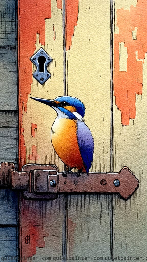 Begin by sketching the kingfisher and the latch with a fine-liner, using short, vertical strokes to define the areas of peeling paint on the door. For the door’s background, apply a variegated wash of warm yellow and pale green, then use a wet-on-dry technique to layer a vibrant, saturated orange over the top, leaving irregular “flakes” of the underpainting visible. For the bird, use a wet-on-wet application to blend bright blue into deep violet on its wing, and a warm, glowing yellow-to-orange gradient for its breast.