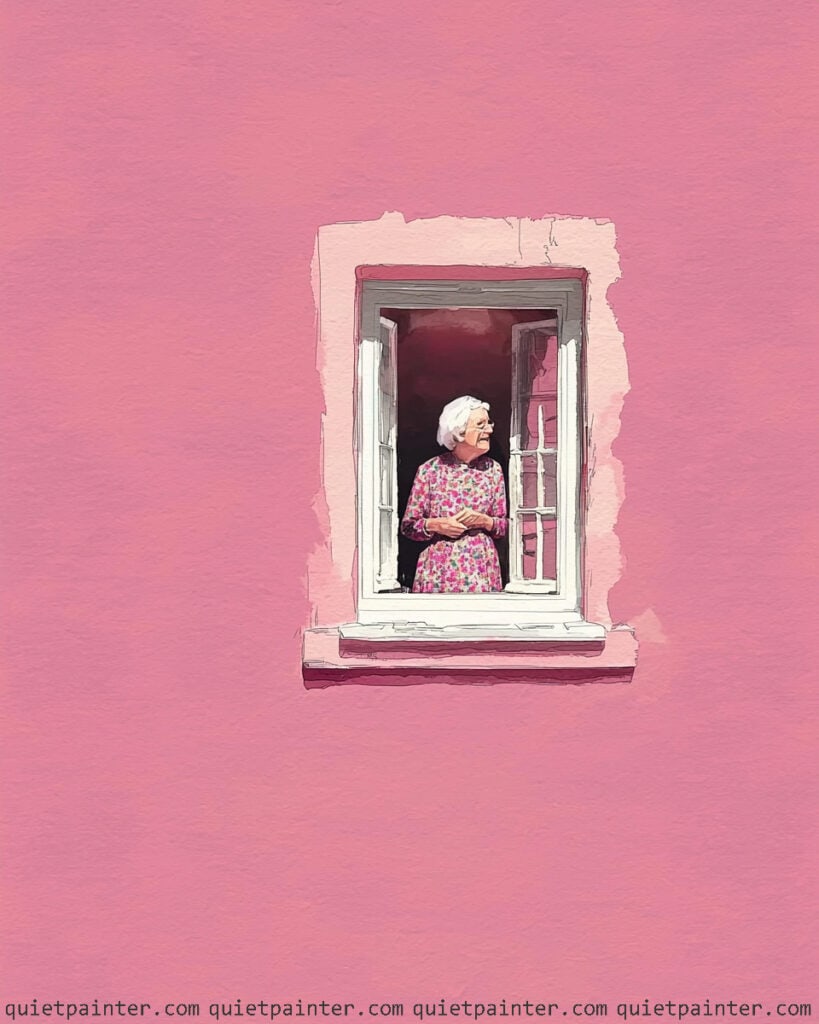 To paint the figure, use a fine round brush to dapple a complex floral pattern on her dress using tiny points of violet, green, and pink over a light base. Carefully define her white hair and facial features with very diluted grey-blue shadows, ensuring you maintain the soft, natural light coming from the side. Finish the piece by glazing a crisp, horizontal shadow beneath the windowsill and along the inner edge of the open window panes to provide structural depth and anchor the scene firmly within the sea of pink.