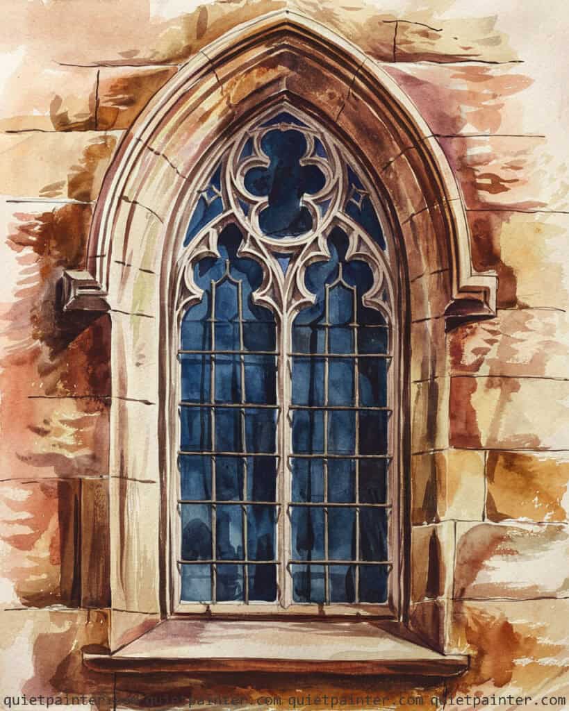 Begin with a precise pencil sketch to capture the intricate tracery of the gothic arch and the geometric grid of the window panes. Apply a variegated wash of warm sienna and ochre across the stonework, and while the paper is still damp, “charge” in darker burnt umber to create the mottled, aged texture of the sandstone. For the window panes, use a saturated wet-on-dry application of deep indigo, carefully cutting around the light-colored stone mullions to create immediate structural depth.