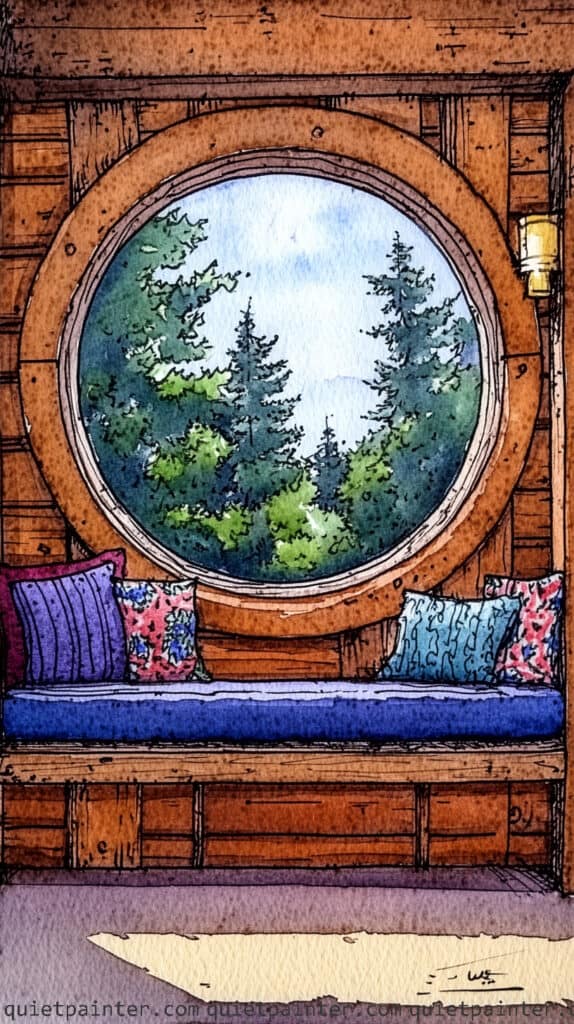 Begin with a precise ink drawing to define the concentric circles of the window frame and the horizontal lines of the wooden interior walls. Use a variegated wash of warm sienna and umber for the woodwork, dropping in darker pigments while damp to suggest natural grain and depth. For the outdoor scene, apply a wet-on-wet technique for the evergreen trees, layering various greens and allowing them to soften into a pale blue-grey sky to create atmospheric perspective.