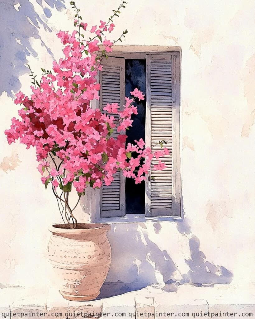 To bring the scene to life, use a saturated dabbing technique for the bougainvillea, layering several shades of pink and magenta to create a sense of lush volume. For the terracotta pot, apply a warm, textured wash of sienna and ochre, deepening the pigment on the right side to create a rounded, three-dimensional effect. Finish the piece by painting the window interior with a deep, dark indigo to provide a strong contrast that makes the bright floral foreground truly pop.